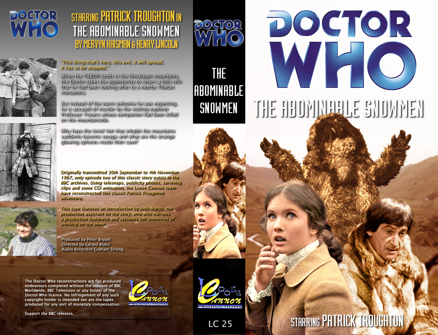 Only one of the six episodes of The Abominable Snowmen is held in the BBC Archives and has been released on the triple DVD set, Lost in Time.The remaining five episodes can be viewed as reconstructions by Loose Cannon Productions.