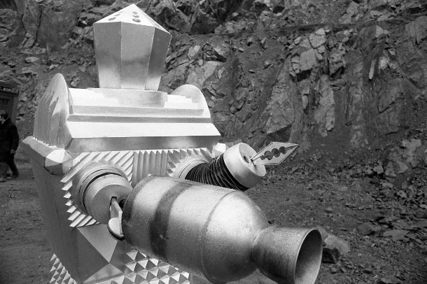 Yet another attempt at a Dalek replacement, the Krotons were a poor substitute. With arms that looked like the robot’s from Lost in Space, the Krotons were disabled by their strange and inflexible metal hands. Possessed of a rather cool spinning head, the poor Krotons were not so lucky with that part of their costume below the waist. A rubber skirt was merely tacked on to disguise the operators’ legs. The concept behind the Kroton’s creation was rather more interesting. Crystalline beings, the Krotons survive in their space-craft, the Dynatrope, in suspended animation in a form of slurry. To reconstitute themselves they must absorb sufficient mental energy. It is for this reason that every year they have taken the best two Gond students, drained them of their mental powers, and then killed them. Rather than exterminating them as the Daleks do, the Krotons “disperse” them in a process in which the victim in essence disintegrates.
