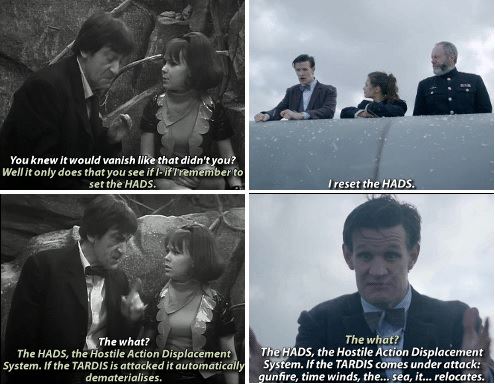 The second part of Series 7 of Doctor Who, which is also referred to as Series 7B, has been said by some to be a “love letter” to Classic Doctor Who. Resplendent with obscure references to Who’s 50 year history, the Eleventh Doctor’s final complete season also contained “shout outs” to the Second Doctor’s tenure. Together with the re-appearance of the Great Intelligence after a 44 year absence and the Ice Warriors following a 39 year hiatus, Series 7 also made reference to the mysterious HADS, the Hostile Action Displacement System. In the same episode that heralded the Ice Warrior’s return, the TARDIS dematerialized from a sinking submarine in the South Pole to the North Pole (Cold War). When functioning correctly the HADS dematerializes the TARDIS to a close-by location when it is under external attack. It needs to be manually set, however, and the Doctor usually forgets to set it. The first and only on-screen reference to HADS prior to Cold War was in the 1968-1969 serial, The Krotons. In that instance the TARDIS relocated several metres up a hill after being attacked by Krotons.