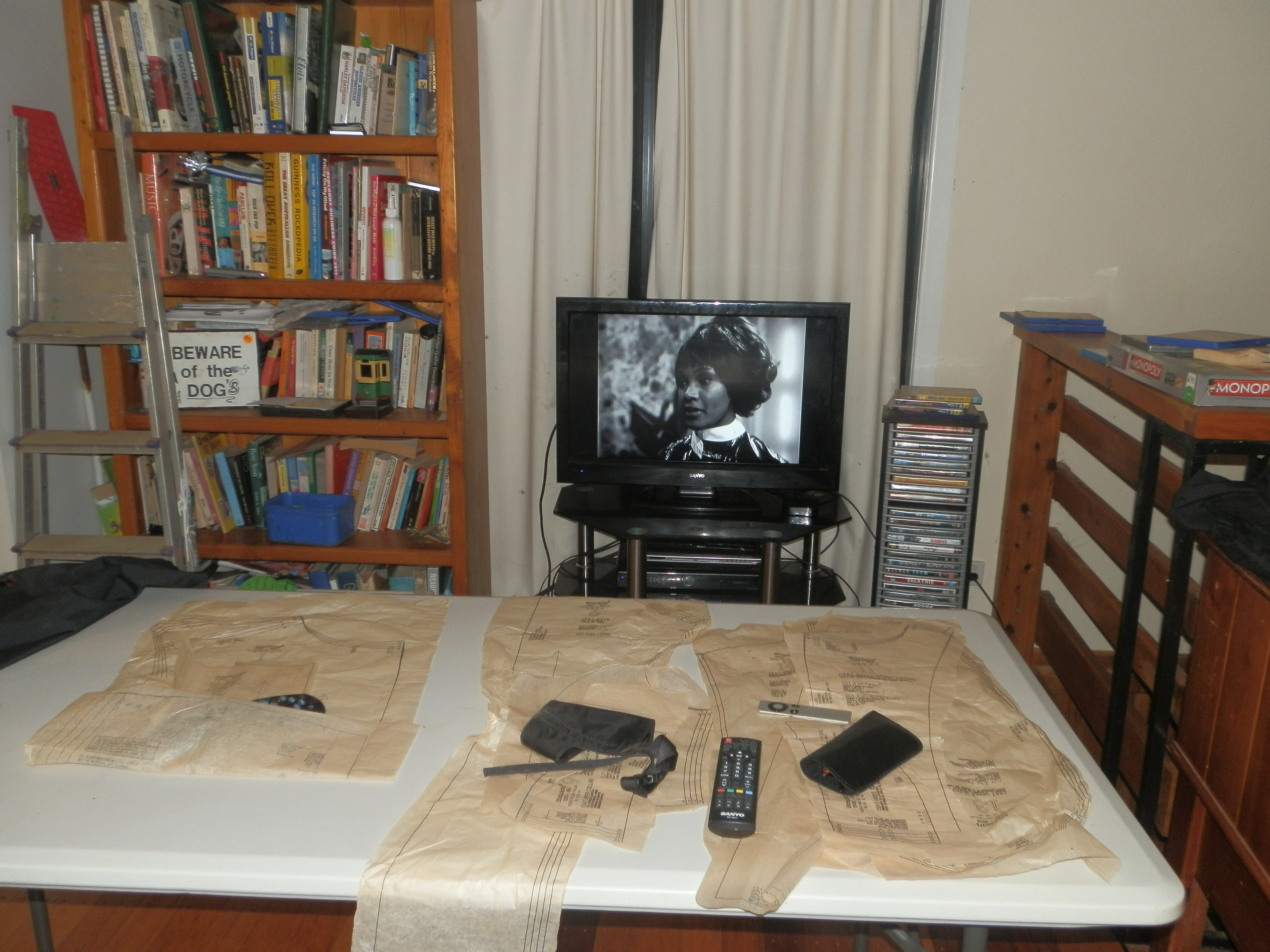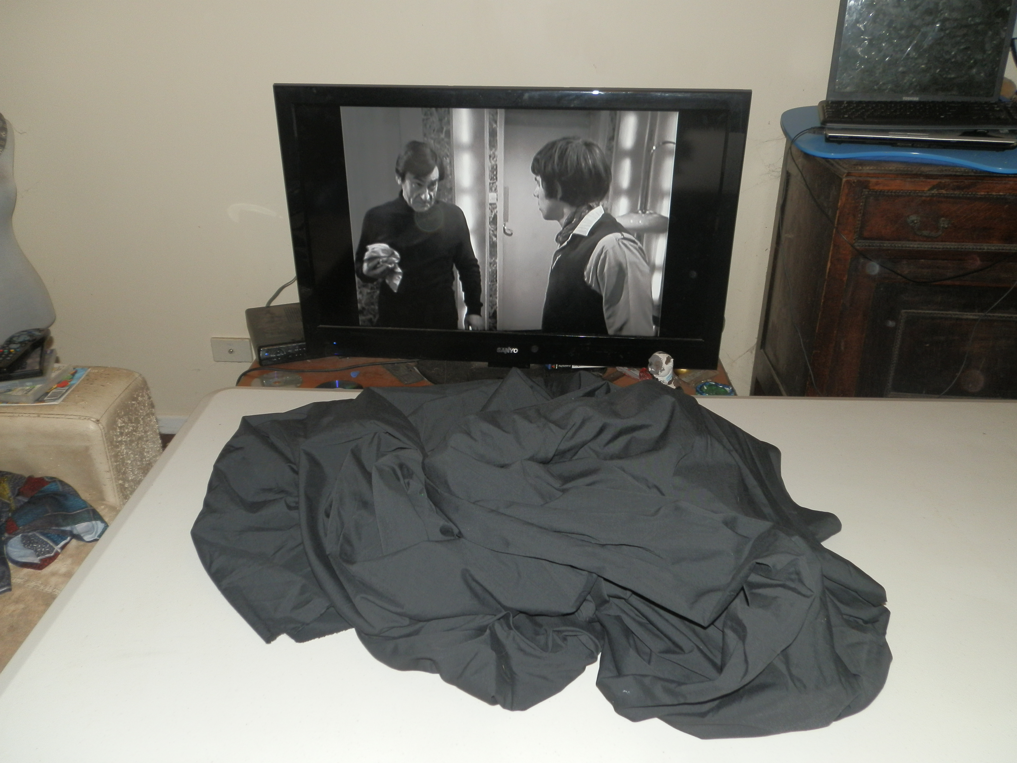 10 metres or more of broadcloth awaits ironing and torture by dressmaking pins. The Doctor and Jamie appear disinterested