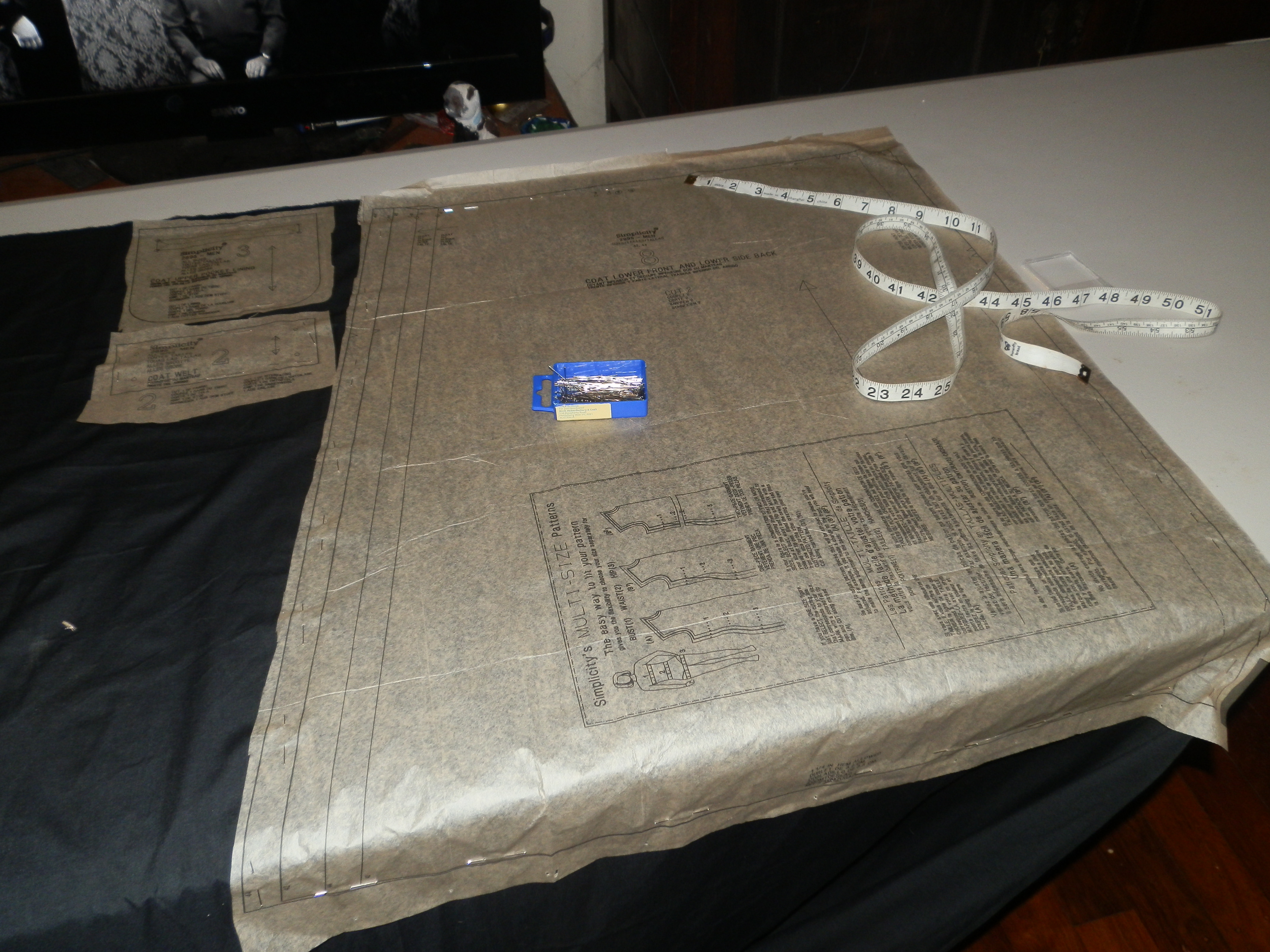 At last the Frock Coat pattern pieces are located and work can begin again. For a while I thought that the Troughton Frock Coat’s career would be as short as Fariah’s, Salamander’s Food Taster in The Enemy of the World. Glasses, dog muzzles and remote controls are used to weigh the pieces down from the wind.